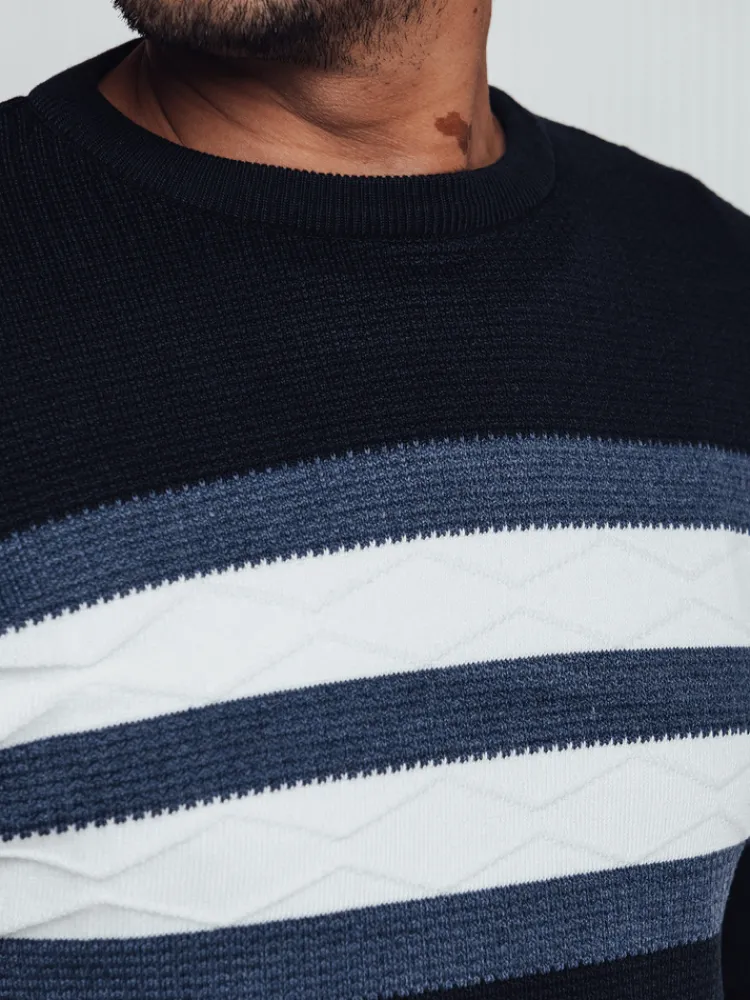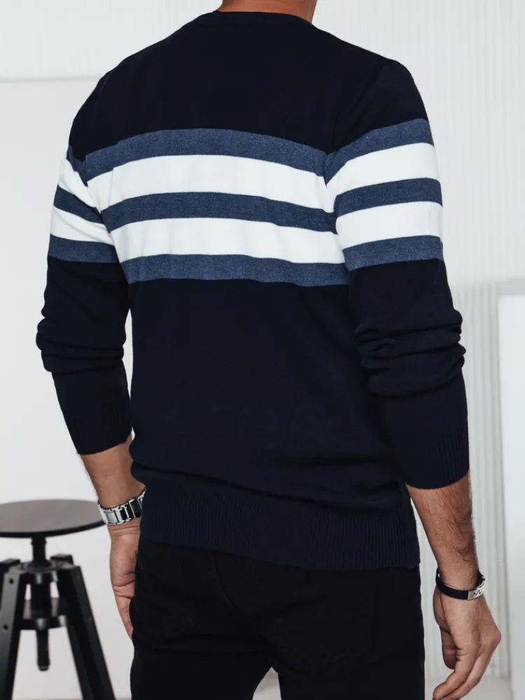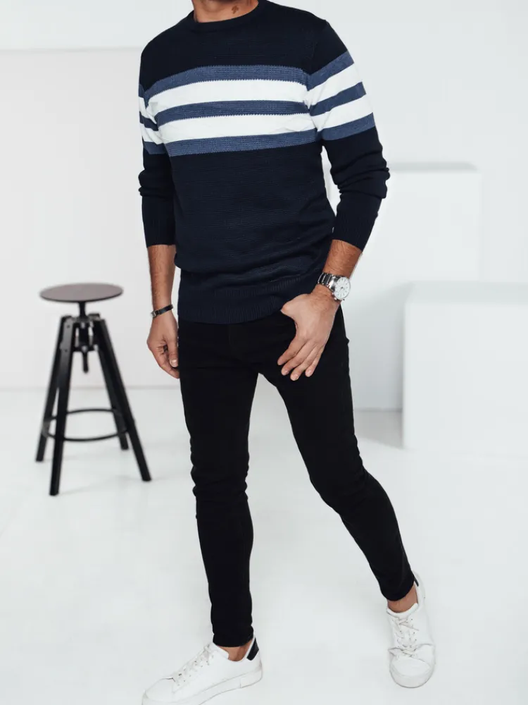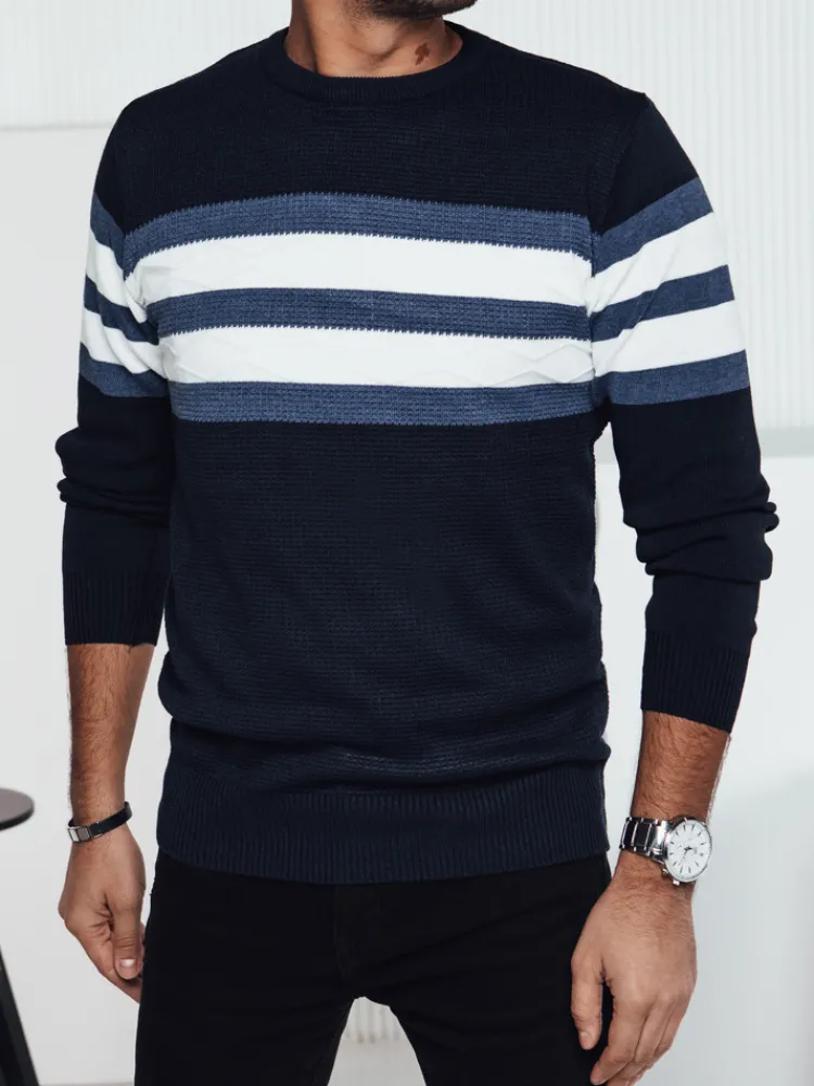 Ten elegancki sweter męski o nowoczesnym fasonie jest doskonałym wyborem na chłodniejsze dni. Wykonany z przyjemnej w dotyku dzianiny, zapewnia komfort i swobodę ruchów. Charakterystyczne paski dodają stylowego akcentu, sprawiając, że świetnie sprawdzi się zarówno na co dzień, jak i na bardziej formalne okazje. Idealny do jeansów i spodni materiałowych.