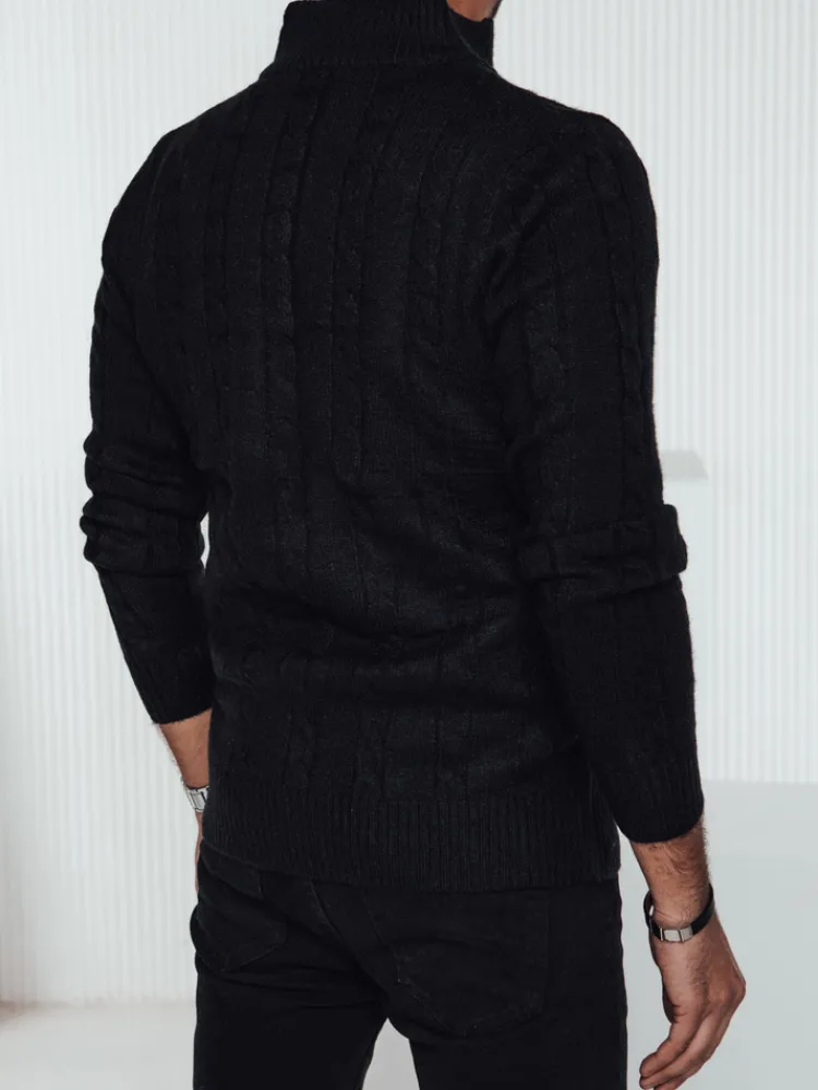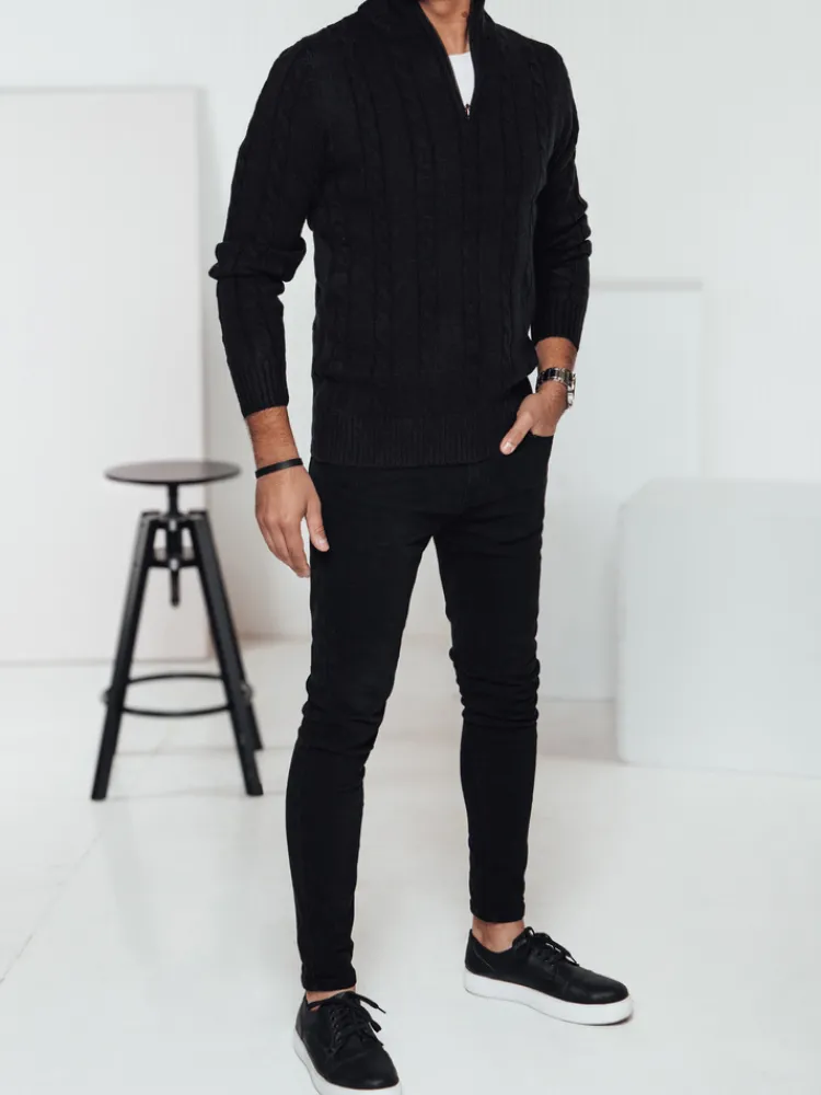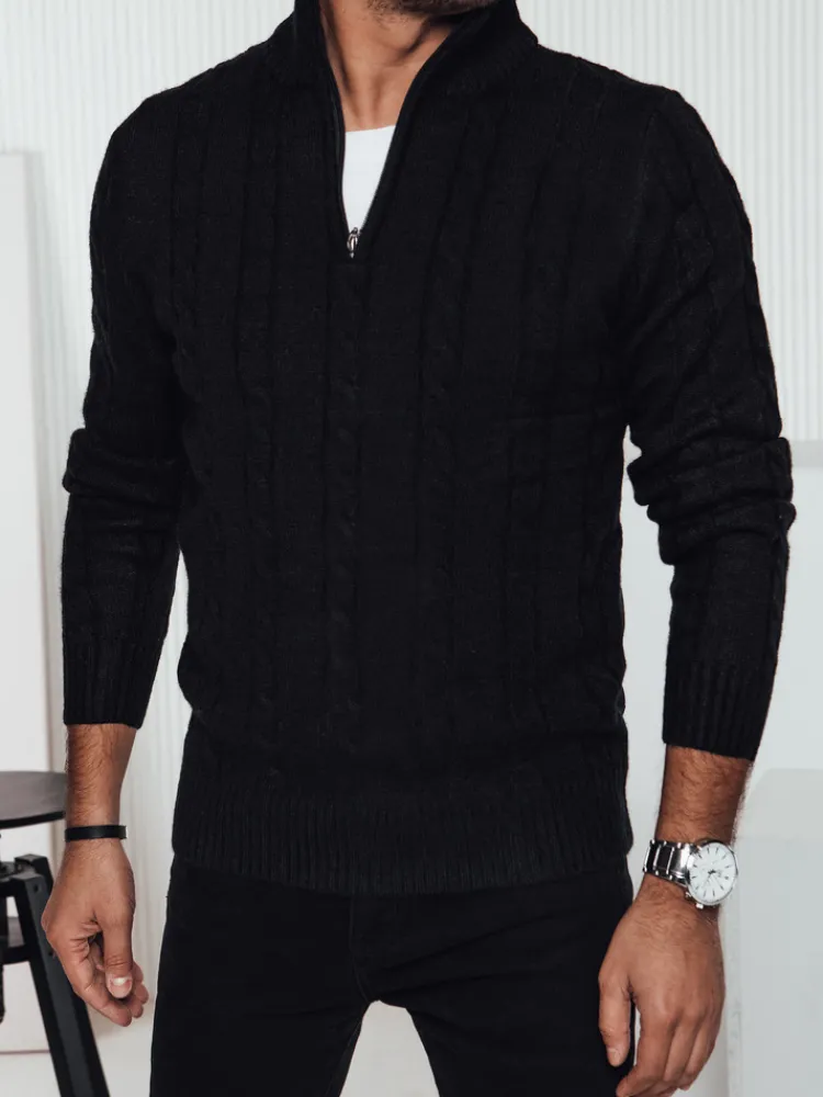 Sweter męski z kołnierzem typu stójka, zapinanym na praktyczny zamek. Wykonany z miękkiego, ciepłego materiału, idealnie sprawdzi się w chłodniejsze dni. Klasyczny wzór warkocza dodaje elegancji i ponadczasowego stylu, który pasuje zarówno do casualowych, jak i bardziej formalnych stylizacji.