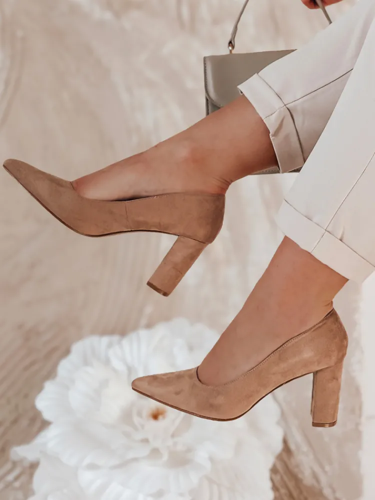 Klasyczne czółenka na stabilnym słupku to połączenie elegancji i wygody. Wykonane z miękkiej zamszowej tkaniny, z komfortową wkładką z ekoskóry, doskonale dopasowują się do stopy. Smukły nosek i 8-centymetrowy obcas podkreślają nogi oraz optycznie je wydłuża, a ponadczasowy design sprawdzi się zarówno na co dzień, jak i na wyjątkowe okazje.