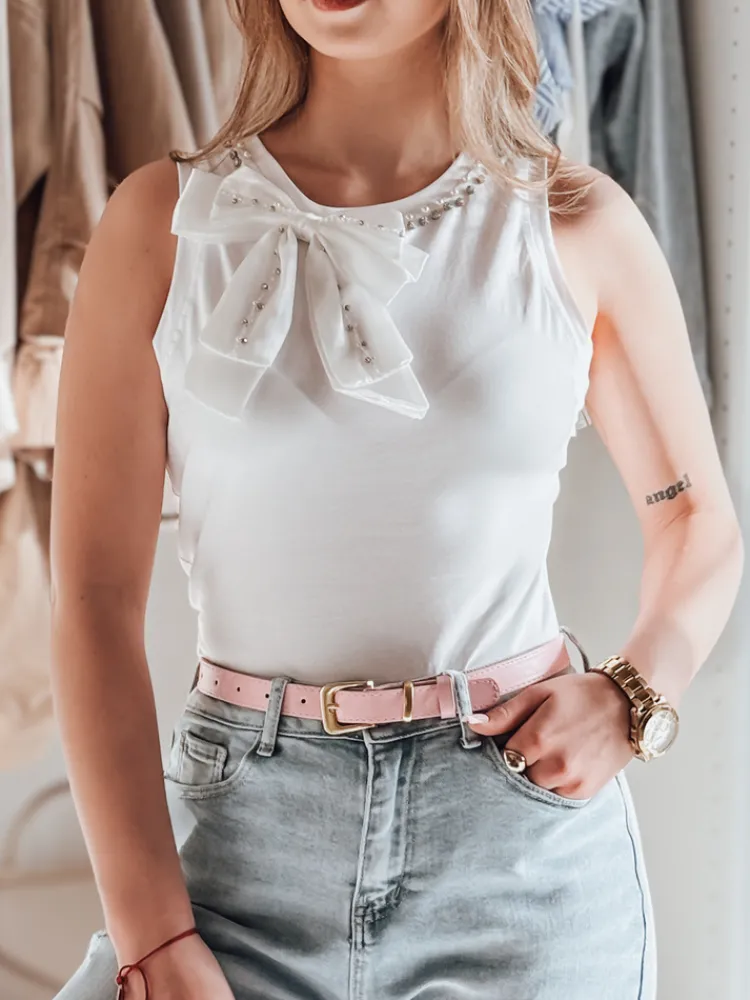 Elegancki t-shirt na ramiączkach z efektowną, dużą kokardą, która dodaje szyku każdej stylizacji. Dekolt ozdobiony subtelnymi perełkami i błyszczącymi cyrkoniami, które nadają mu wyjątkowego charakteru. Wykonany z miękkiego i elastycznego materiału, idealnie dopasowuje się do sylwetki, zapewniając komfort noszenia na co dzień oraz w wyjątkowych okazjach.