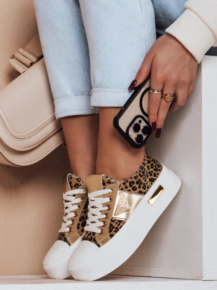 Trampki damskie na wysokiej platformie wykonane z materiału tkaninowego. Cholewka jest sznurowana. Buty posiadają ozdobę w formie diamencików, która dodaje uroku oraz szyku. Pasują zarówno do spodni, jak i sukienek, co czyni je uniwersalnym wyborem na każdą okazję.