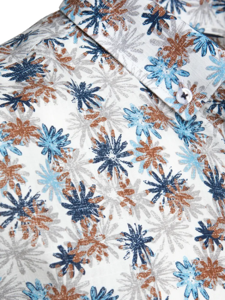 Męska koszula casualowa o efektownym wzorze w kontrastowe kwiaty, idealna na wiosnę i lato. Model slim fit podkreślający sylwetkę, zapinany na klasyczne guziki. Koszula posiada klasyczny kołnierzyk oraz długie rękawy zakończone mankietami z regulowanym zapięciem. Świetny wybór na co dzień i na luźniejsze okazje.