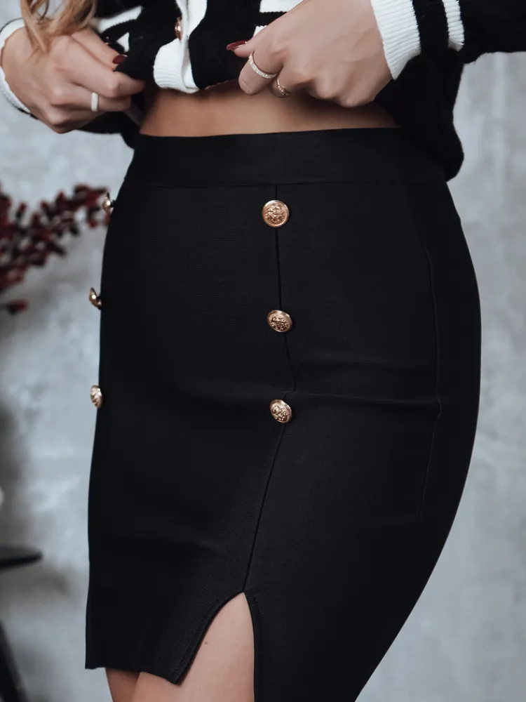 Ta stylowa mini spódnica z ozdobnymi guzikami to kwintesencja elegancji i kobiecego szyku. Jej przemyślany krój doskonale modeluje sylwetkę, a subtelne rozcięcia nadają jej zmysłowego charakteru. Doskonały wybór na wieczorne wyjścia lub formalne okazje, aby wyglądać modnie i czuć się komfortowo.
