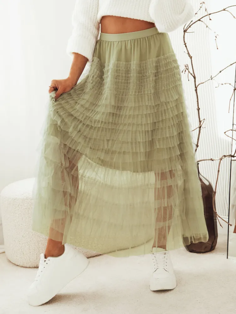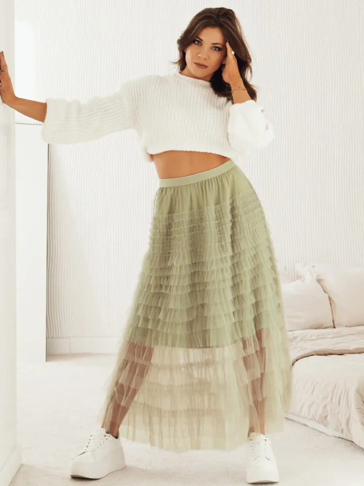Tiulowa spódnica o długości maxi to niezmiennie bezbłędny wyznacznik trendów. Modna długość, gumka w pasie, ciekawe przeszycia tiulu tworzą stylową całość. Idealnie zaprezentuje się zarówno w eleganckim, jak i casualowym wydaniu. Dostępna w trzech kolorach.