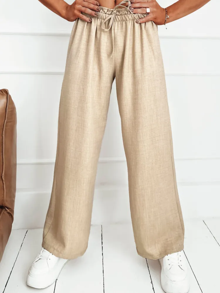 Wykonane z wysokiej jakości spodnie o najmodniejszym fasonie wide leg to niezbędnik, jeśli chodzi o sezon wiosenno-letni. Model posiada w pasie gumkę oraz wiązanie, dzięki czemu idealnie dopasowuje się do talii, oraz będzie wyglądał bezbłędnie na każdym typie figury. Tworzy perfekcyjny komplet z bluzą MADDIE.