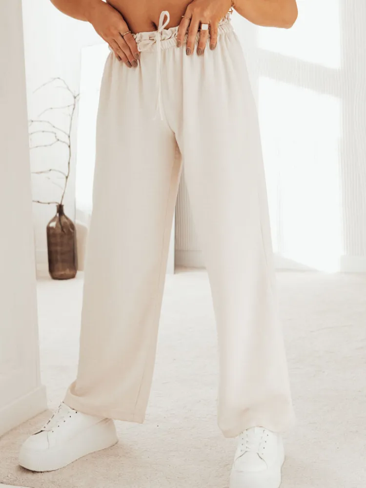 Wykonane z wysokiej jakości spodnie o najmodniejszym fasonie wide leg to niezbędnik, jeśli chodzi o sezon wiosenno-letni. Model posiada w pasie gumkę oraz wiązanie, dzięki czemu idealnie dopasowuje się do talii, oraz będzie wyglądał bezbłędnie na każdym typie figury. Tworzy perfekcyjny komplet z bluzą MADDIE.