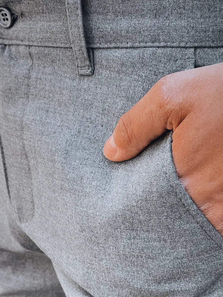 Męskie spodnie materiałowe.Wykonane z przyjemnego w dotyku materiału.Zapinane na zamek błyskawiczny.Dwie skośne kie…
