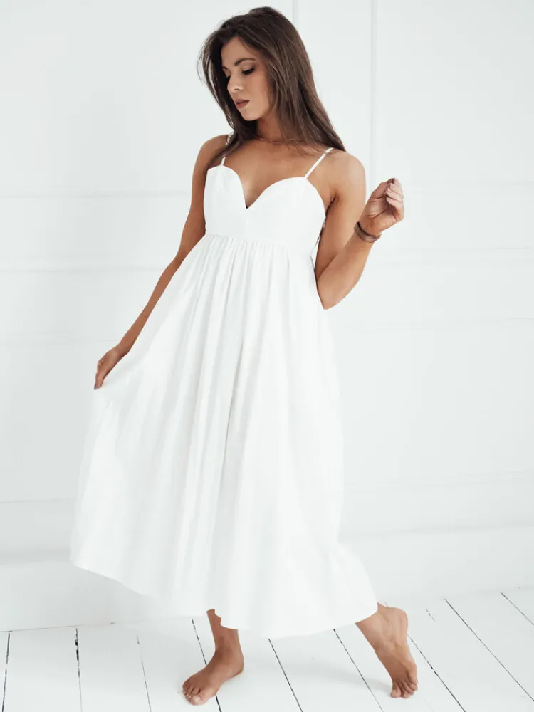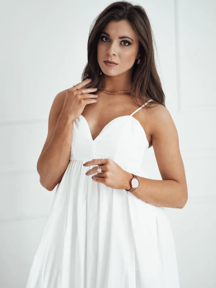 Niezwykle kobieca i jednocześnie urocza propozycja wykonana z wysokiej jakości materiału. Sukienka o długości midi posiada efektownie wyglądający dekolt, regulowane ramiączka, zapinanie na suwak umiejscowiony z boku oraz szeroką gumkę na plecach co gwarantuje idealne dopasowanie do ciała. Dostępna w czterech kolorach.